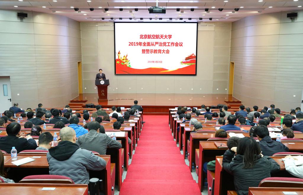 北航新闻网3月27日电(记者 王晴/文 邸白鹭/摄影) 3月26日下午,学校2019年全面从严治党工作会议暨警示教育大会在新主楼会议中心第一报告厅举行,会议由校长徐惠彬主持。